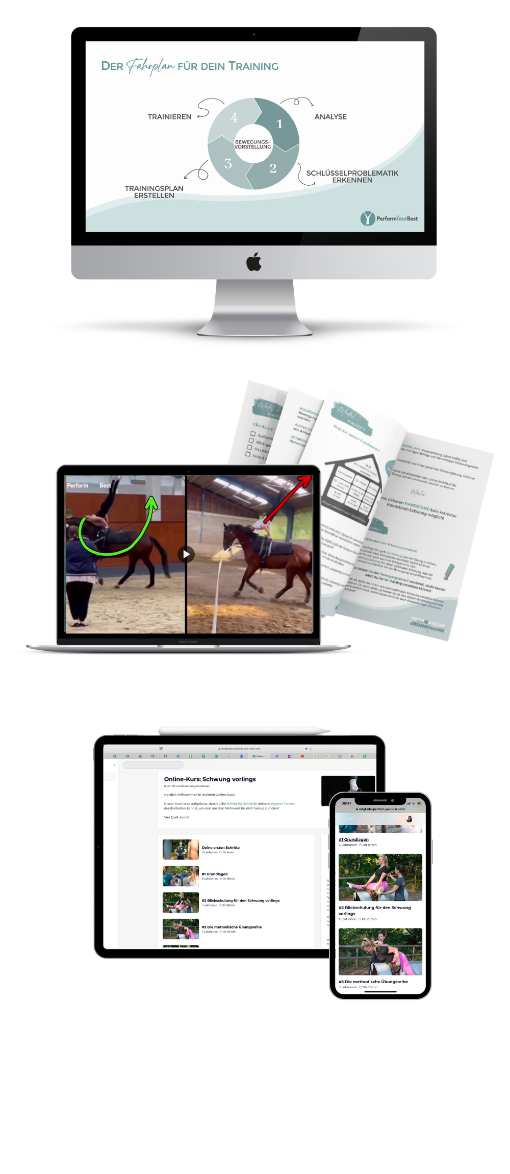 In diesem Modul geht es darum, das Erlernte umzusetzen und zu erkennen, worauf man bei den Vorübungen achten muss. Hierbei gibt es Beispiele für jede Übung auch auf dem Pferd.